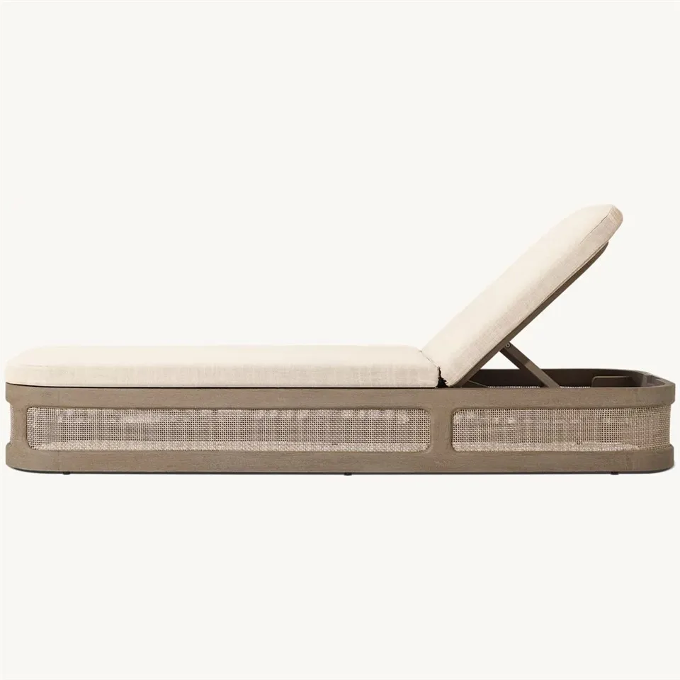 Nou an tise chaise lounge deyò fèt ak koulè bwa natirèl, ki reflete konsèp nan lavi ki an sante ak zanmitay anviwònman an. Konsepsyon an senp diminye mal nan sibstans danjere nan kò imen an, ak kousen chèz la gri kowòdone ak ton an jeneral, ki ogmante amoni vizyèl la ak bote. Sa a tise chaise lounge deyò se patikilyèman apwopriye pou divès kote deyò, tankou jaden, balkon, teras, lakou ak plaj. Kit nan espas piblik oswa prive, li ka fè travay la parfe.